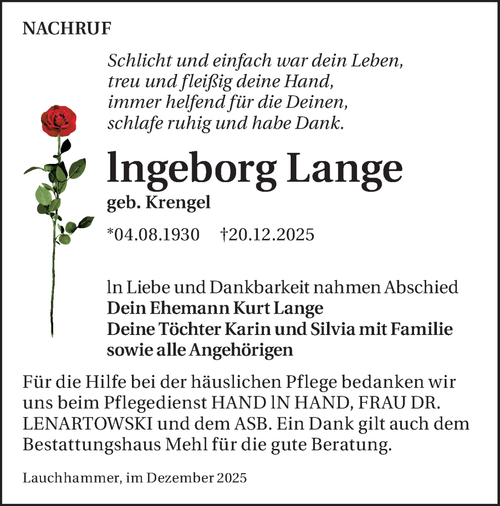 Hier finden Sie alle Traueranzeigen aus der Zeitung, die bisher für Ingeborg Lange erschienen sind. Weitere Traueranzeigen, die in der Zeitung erscheinen, werden hier ebenfalls aufgelistet