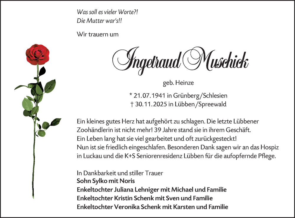 Hier finden Sie alle Traueranzeigen aus der Zeitung, die bisher für Ingetraud Muschick erschienen sind. Weitere Traueranzeigen, die in der Zeitung erscheinen, werden hier ebenfalls aufgelistet