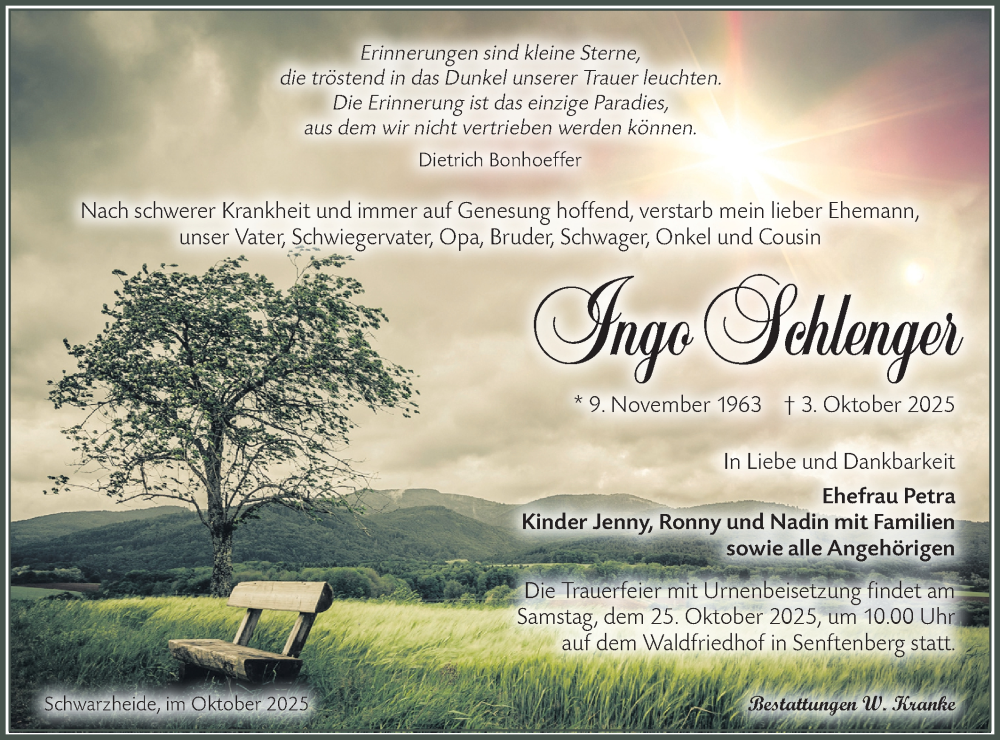 Hier finden Sie alle Traueranzeigen aus der Zeitung, die bisher für Ingo Schlenger erschienen sind. Weitere Traueranzeigen, die in der Zeitung erscheinen, werden hier ebenfalls aufgelistet