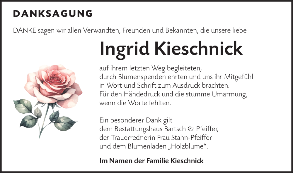 Hier finden Sie alle Traueranzeigen aus der Zeitung, die bisher für Ingrid Kieschnick erschienen sind. Weitere Traueranzeigen, die in der Zeitung erscheinen, werden hier ebenfalls aufgelistet