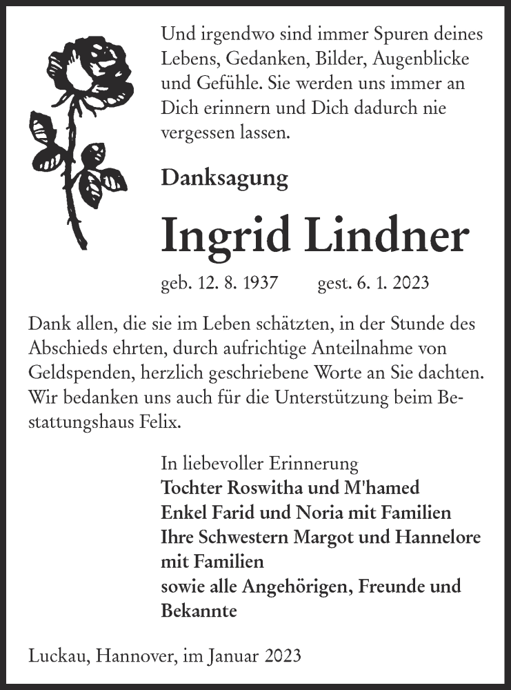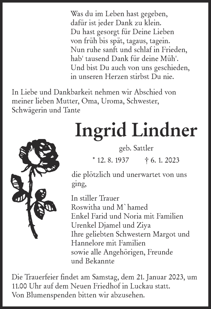 Hier finden Sie alle Traueranzeigen aus der Zeitung, die bisher für Ingrid Lindner erschienen sind. Weitere Traueranzeigen, die in der Zeitung erscheinen, werden hier ebenfalls aufgelistet