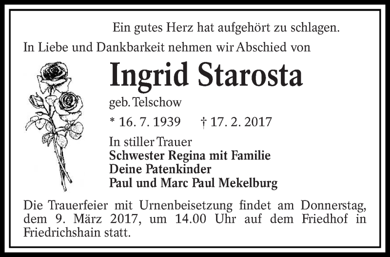 Hier finden Sie alle Traueranzeigen aus der Zeitung, die bisher für Ingrid Starosta erschienen sind. Weitere Traueranzeigen, die in der Zeitung erscheinen, werden hier ebenfalls aufgelistet