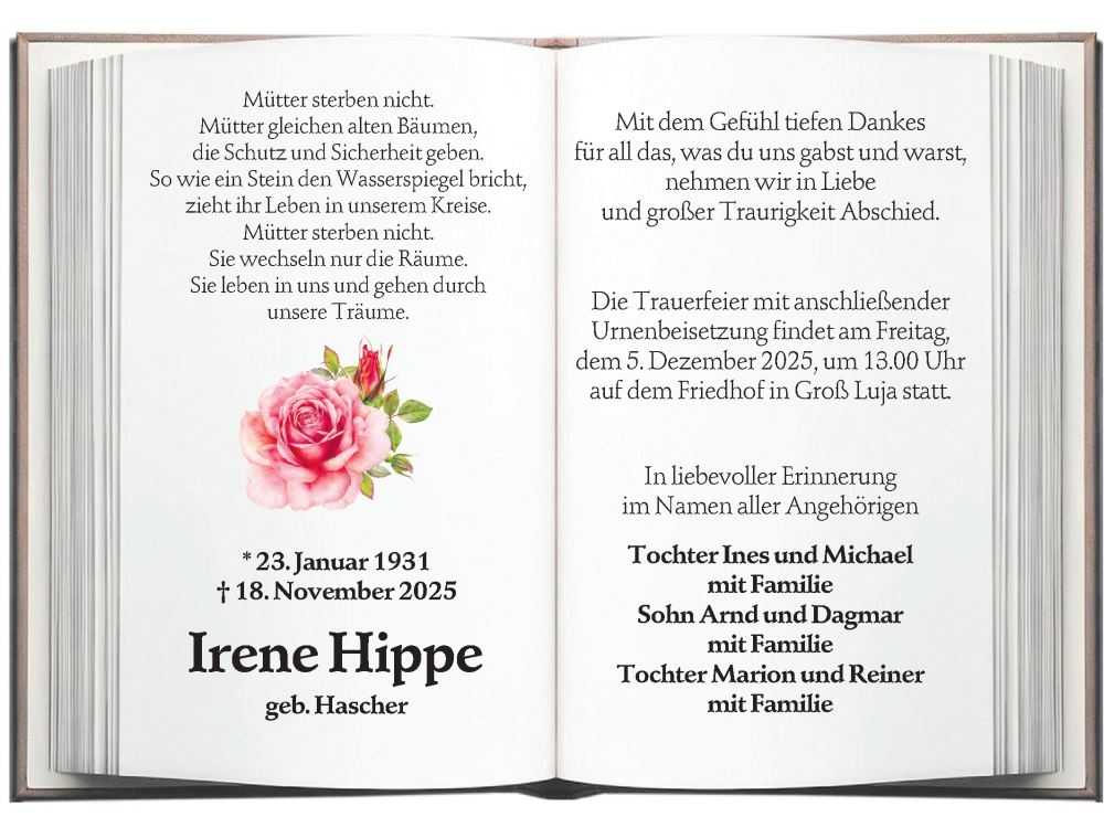 Hier finden Sie alle Traueranzeigen aus der Zeitung, die bisher für Irene Hippe erschienen sind. Weitere Traueranzeigen, die in der Zeitung erscheinen, werden hier ebenfalls aufgelistet