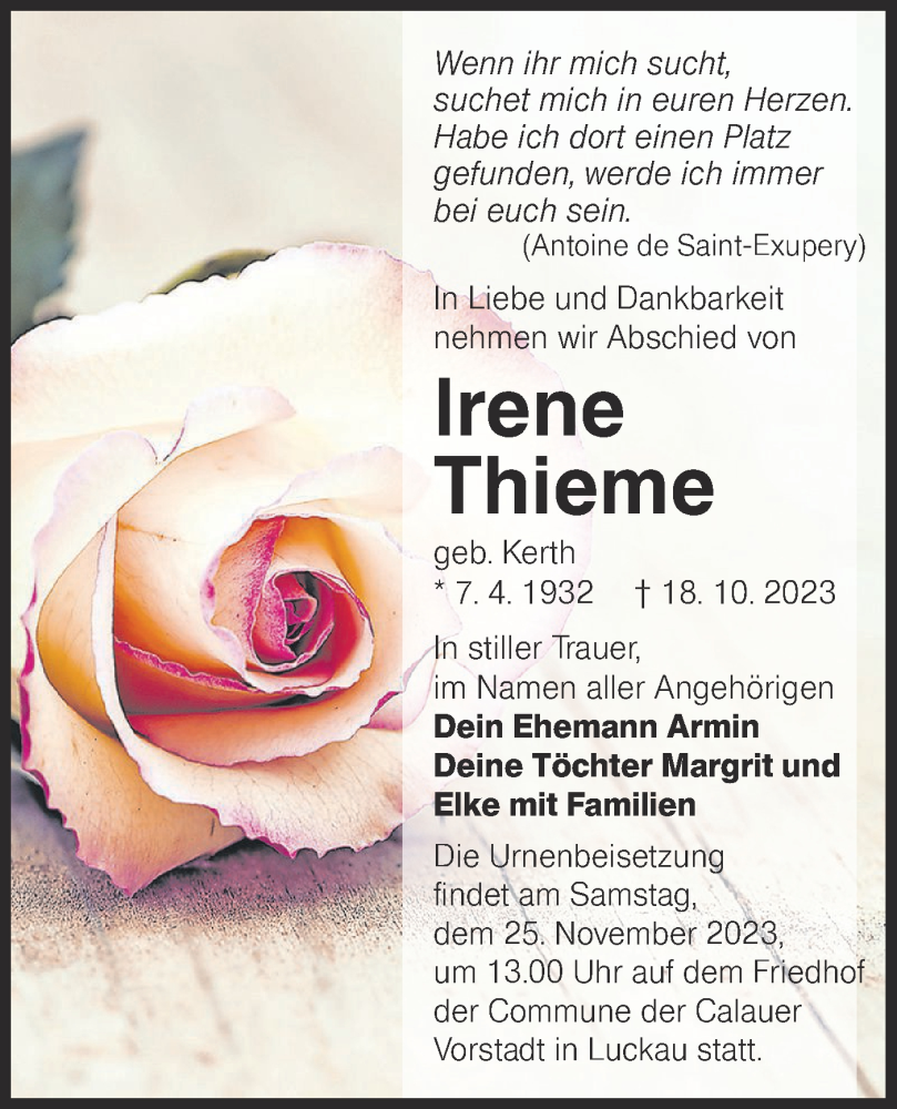 Hier finden Sie alle Traueranzeigen aus der Zeitung, die bisher für Irene Thieme erschienen sind. Weitere Traueranzeigen, die in der Zeitung erscheinen, werden hier ebenfalls aufgelistet