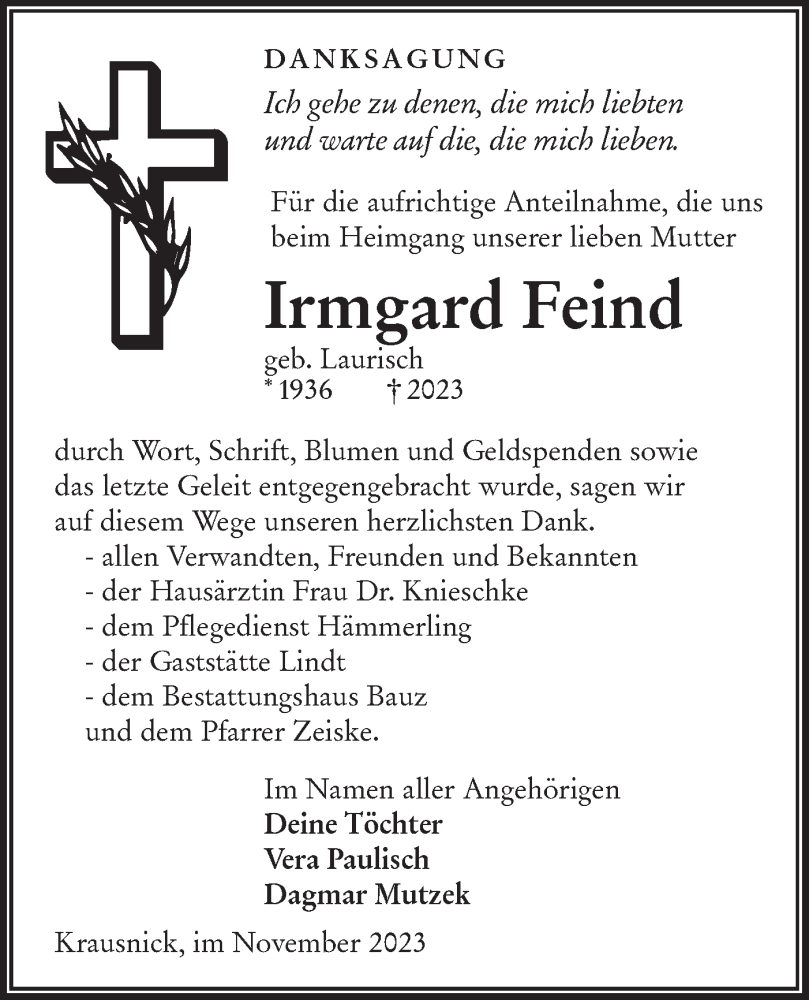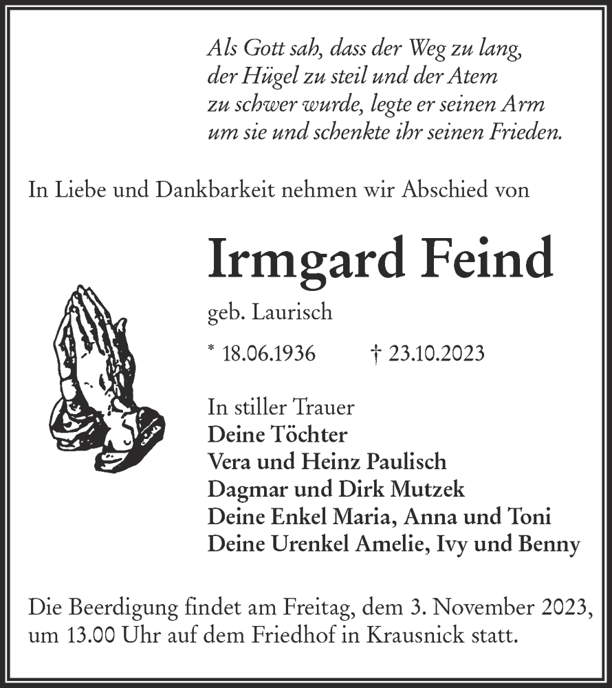 Hier finden Sie alle Traueranzeigen aus der Zeitung, die bisher für Irmgard Feind erschienen sind. Weitere Traueranzeigen, die in der Zeitung erscheinen, werden hier ebenfalls aufgelistet