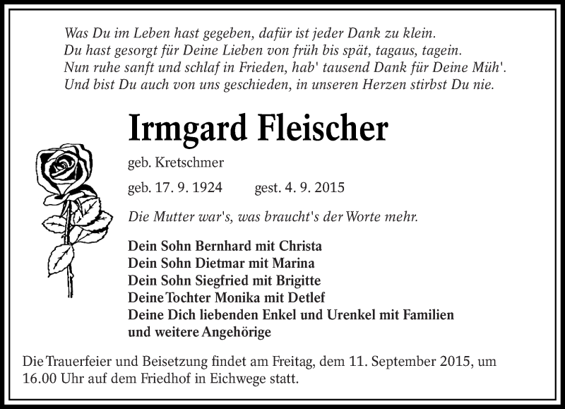 Hier finden Sie alle Traueranzeigen aus der Zeitung, die bisher für Irmgard Fleischer erschienen sind. Weitere Traueranzeigen, die in der Zeitung erscheinen, werden hier ebenfalls aufgelistet