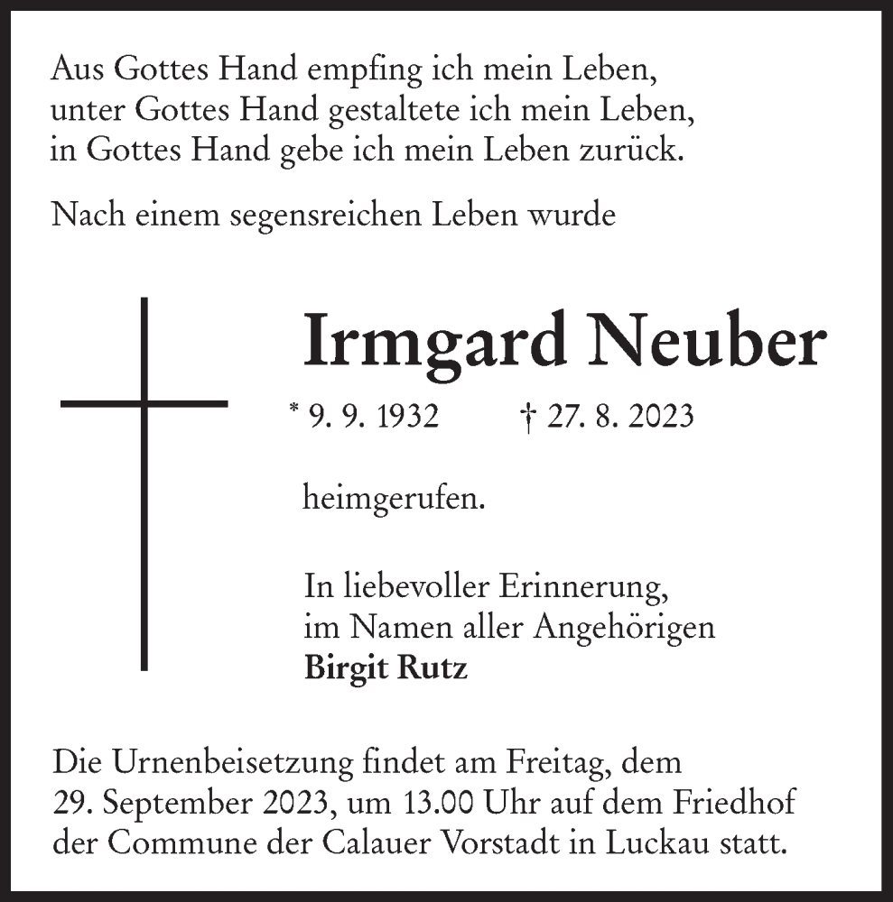 Hier finden Sie alle Traueranzeigen aus der Zeitung, die bisher für Irmgard Neuber erschienen sind. Weitere Traueranzeigen, die in der Zeitung erscheinen, werden hier ebenfalls aufgelistet