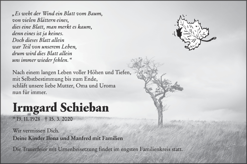 Hier finden Sie alle Traueranzeigen aus der Zeitung, die bisher für Irmgard Schieban erschienen sind. Weitere Traueranzeigen, die in der Zeitung erscheinen, werden hier ebenfalls aufgelistet