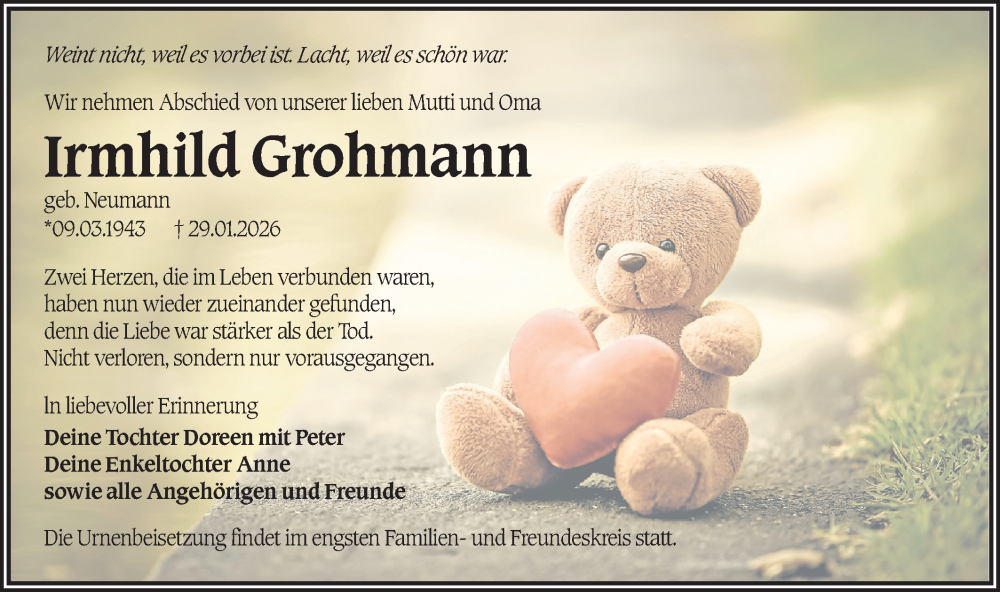Hier finden Sie alle Traueranzeigen aus der Zeitung, die bisher für Irmhild Grohmann erschienen sind. Weitere Traueranzeigen, die in der Zeitung erscheinen, werden hier ebenfalls aufgelistet