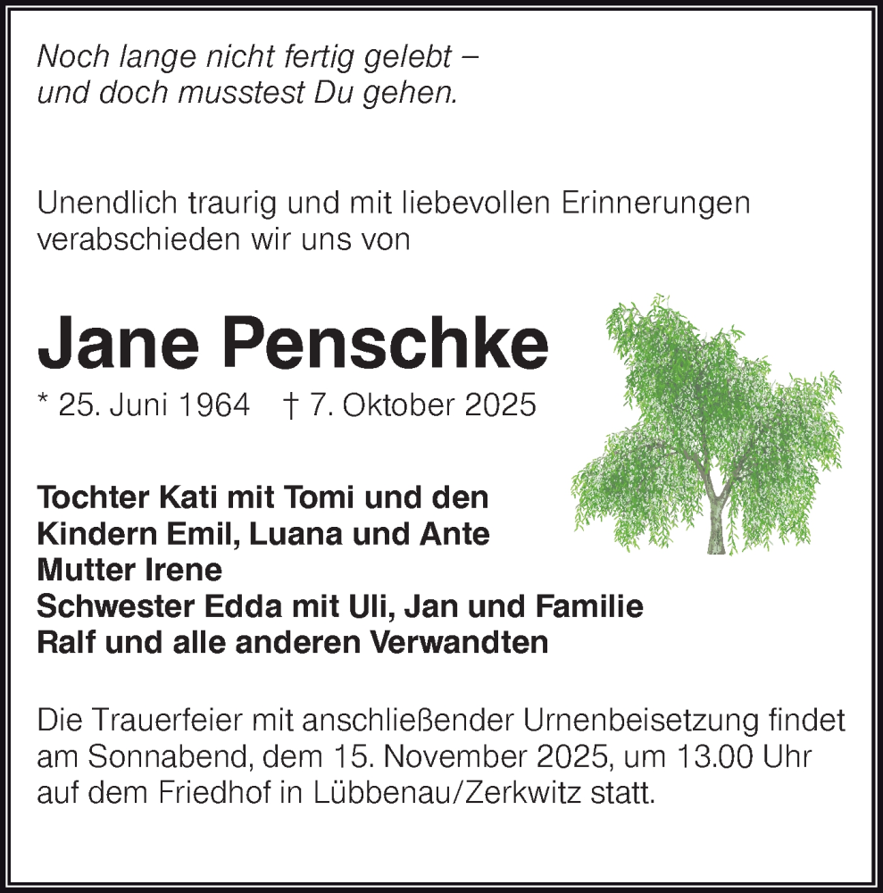 Hier finden Sie alle Traueranzeigen aus der Zeitung, die bisher für Jane Penschke erschienen sind. Weitere Traueranzeigen, die in der Zeitung erscheinen, werden hier ebenfalls aufgelistet