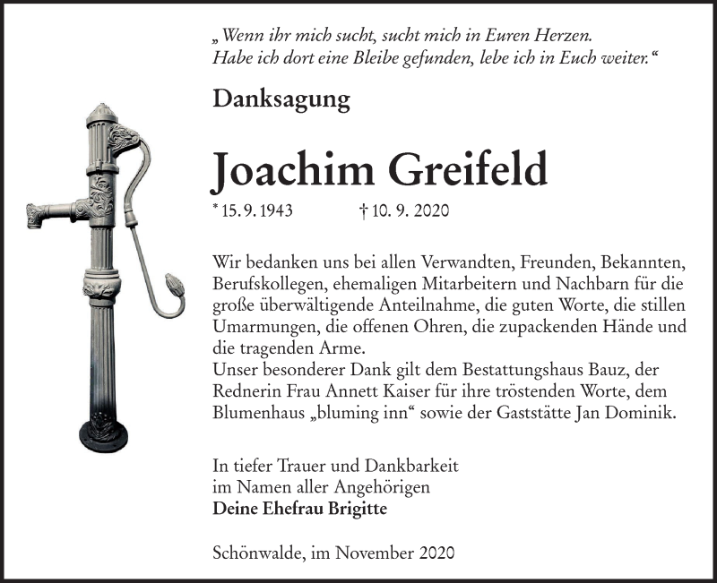 Hier finden Sie alle Traueranzeigen aus der Zeitung, die bisher für Joachim Greifeld erschienen sind. Weitere Traueranzeigen, die in der Zeitung erscheinen, werden hier ebenfalls aufgelistet