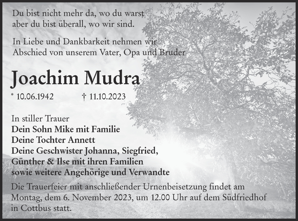 Hier finden Sie alle Traueranzeigen aus der Zeitung, die bisher für Joachim Mudra erschienen sind. Weitere Traueranzeigen, die in der Zeitung erscheinen, werden hier ebenfalls aufgelistet