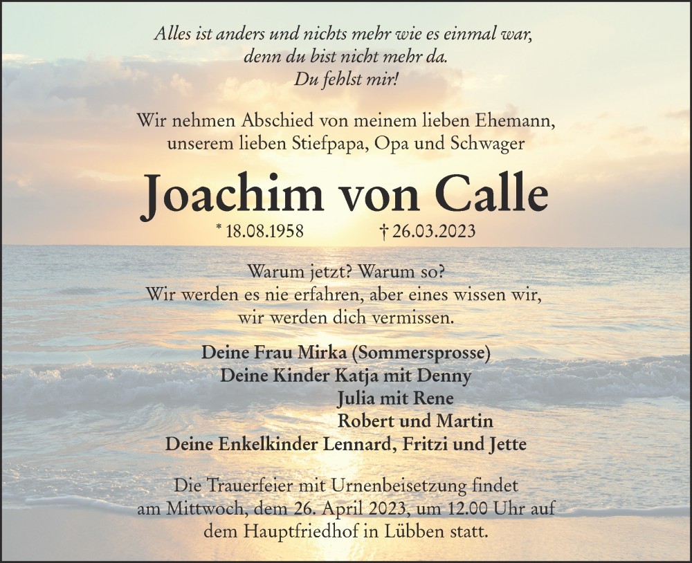 Hier finden Sie alle Traueranzeigen aus der Zeitung, die bisher für Joachim von Calle erschienen sind. Weitere Traueranzeigen, die in der Zeitung erscheinen, werden hier ebenfalls aufgelistet