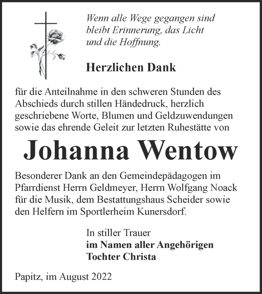 Hier finden Sie alle Traueranzeigen aus der Zeitung, die bisher für Johanna Wentow erschienen sind. Weitere Traueranzeigen, die in der Zeitung erscheinen, werden hier ebenfalls aufgelistet