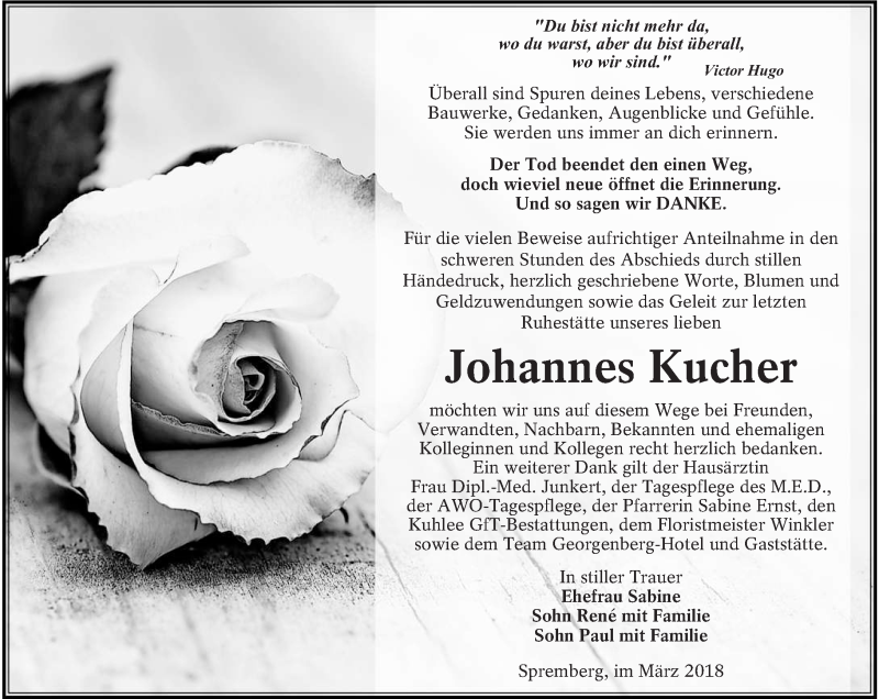 Hier finden Sie alle Traueranzeigen aus der Zeitung, die bisher für Johannes Kucher erschienen sind. Weitere Traueranzeigen, die in der Zeitung erscheinen, werden hier ebenfalls aufgelistet