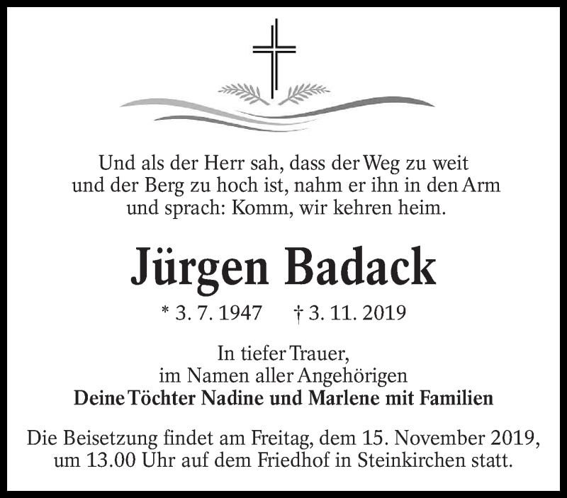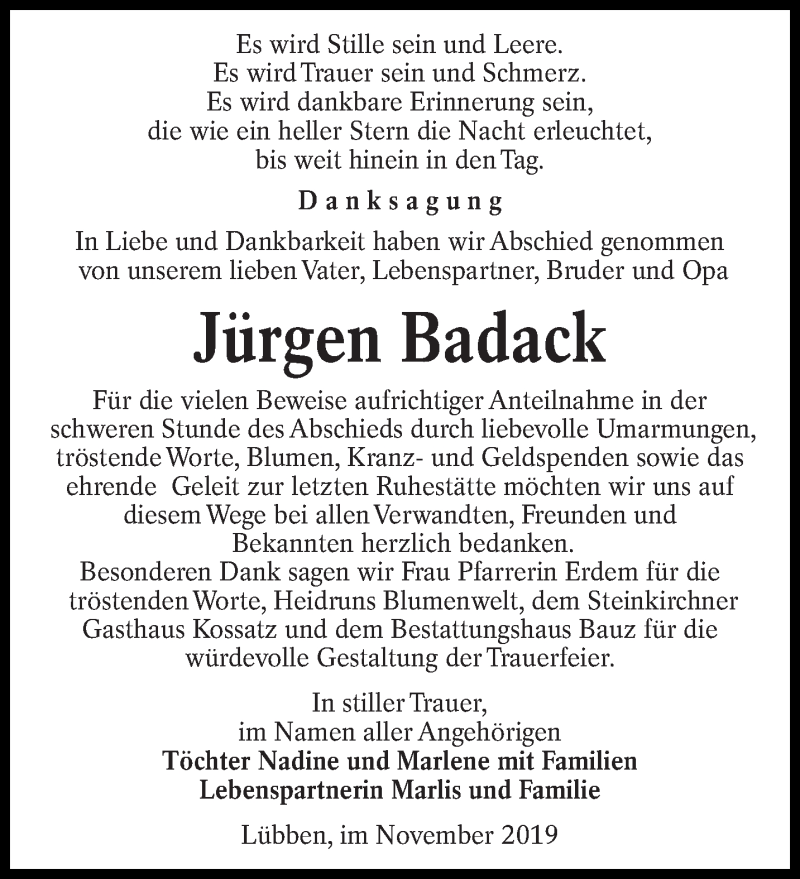 Hier finden Sie alle Traueranzeigen aus der Zeitung, die bisher für Jürgen Badack erschienen sind. Weitere Traueranzeigen, die in der Zeitung erscheinen, werden hier ebenfalls aufgelistet