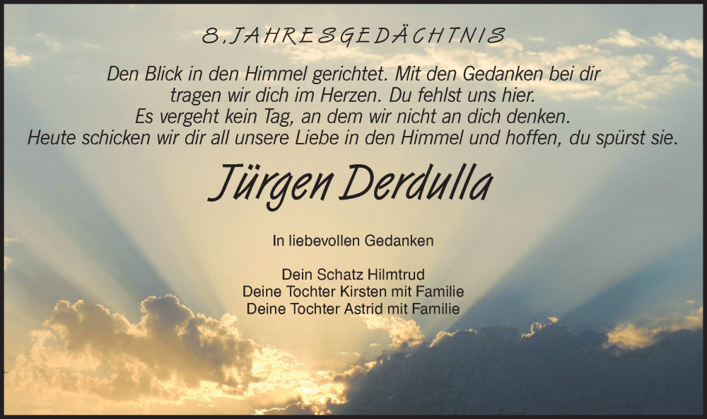 Hier finden Sie alle Traueranzeigen aus der Zeitung, die bisher für Jürgen Derdulla erschienen sind. Weitere Traueranzeigen, die in der Zeitung erscheinen, werden hier ebenfalls aufgelistet