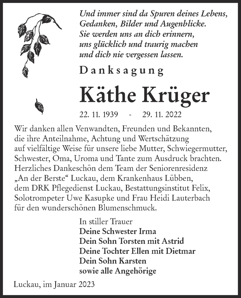 Hier finden Sie alle Traueranzeigen aus der Zeitung, die bisher für Käthe Krüger erschienen sind. Weitere Traueranzeigen, die in der Zeitung erscheinen, werden hier ebenfalls aufgelistet