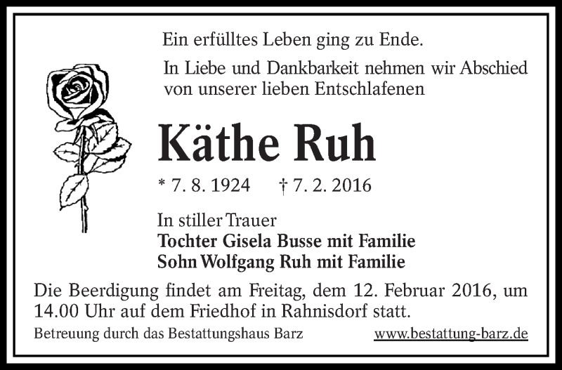 Hier finden Sie alle Traueranzeigen aus der Zeitung, die bisher für Käthe Ruh erschienen sind. Weitere Traueranzeigen, die in der Zeitung erscheinen, werden hier ebenfalls aufgelistet