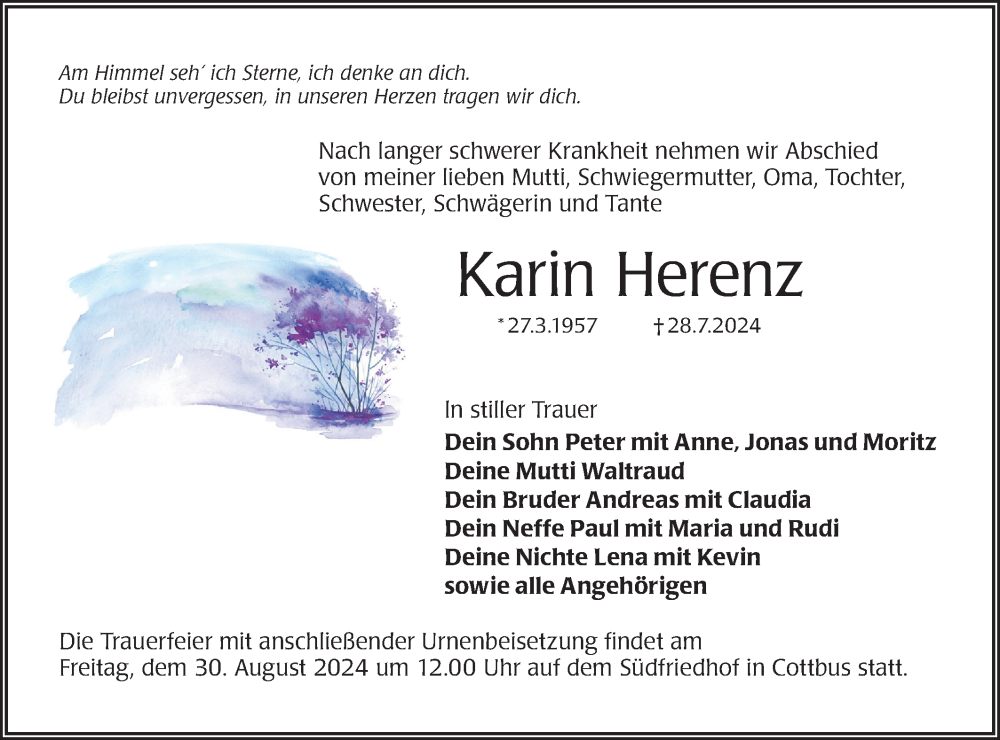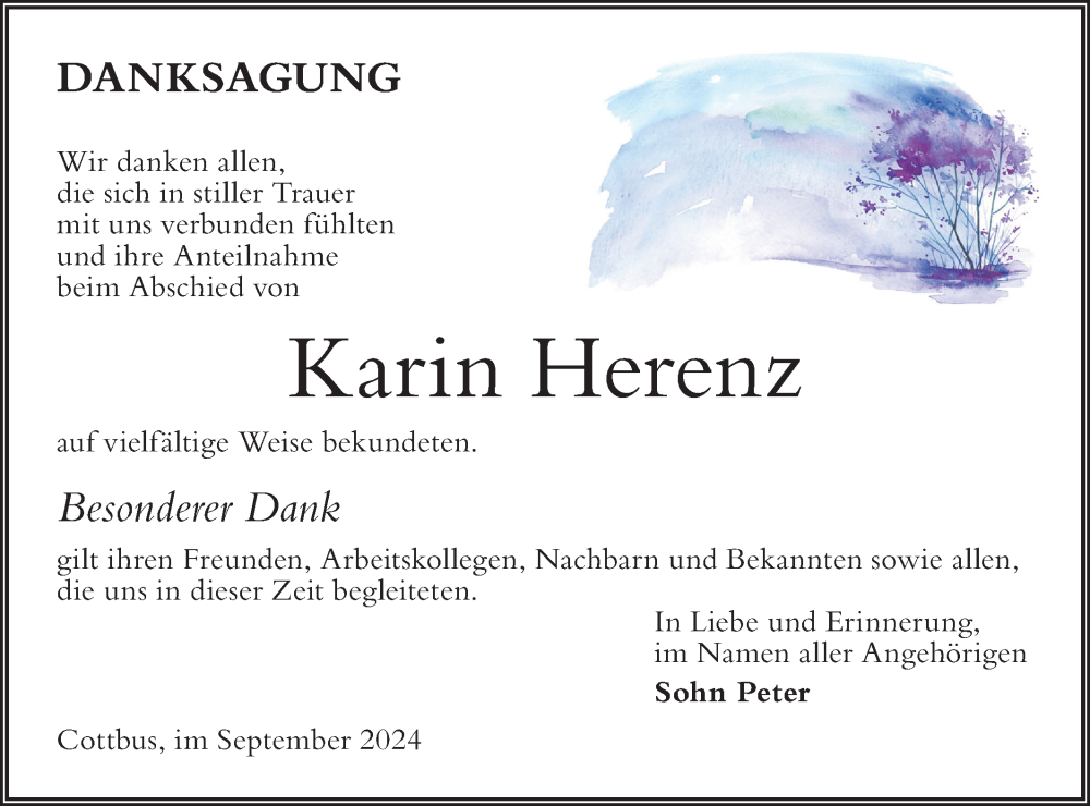 Hier finden Sie alle Traueranzeigen aus der Zeitung, die bisher für Karin Herenz erschienen sind. Weitere Traueranzeigen, die in der Zeitung erscheinen, werden hier ebenfalls aufgelistet