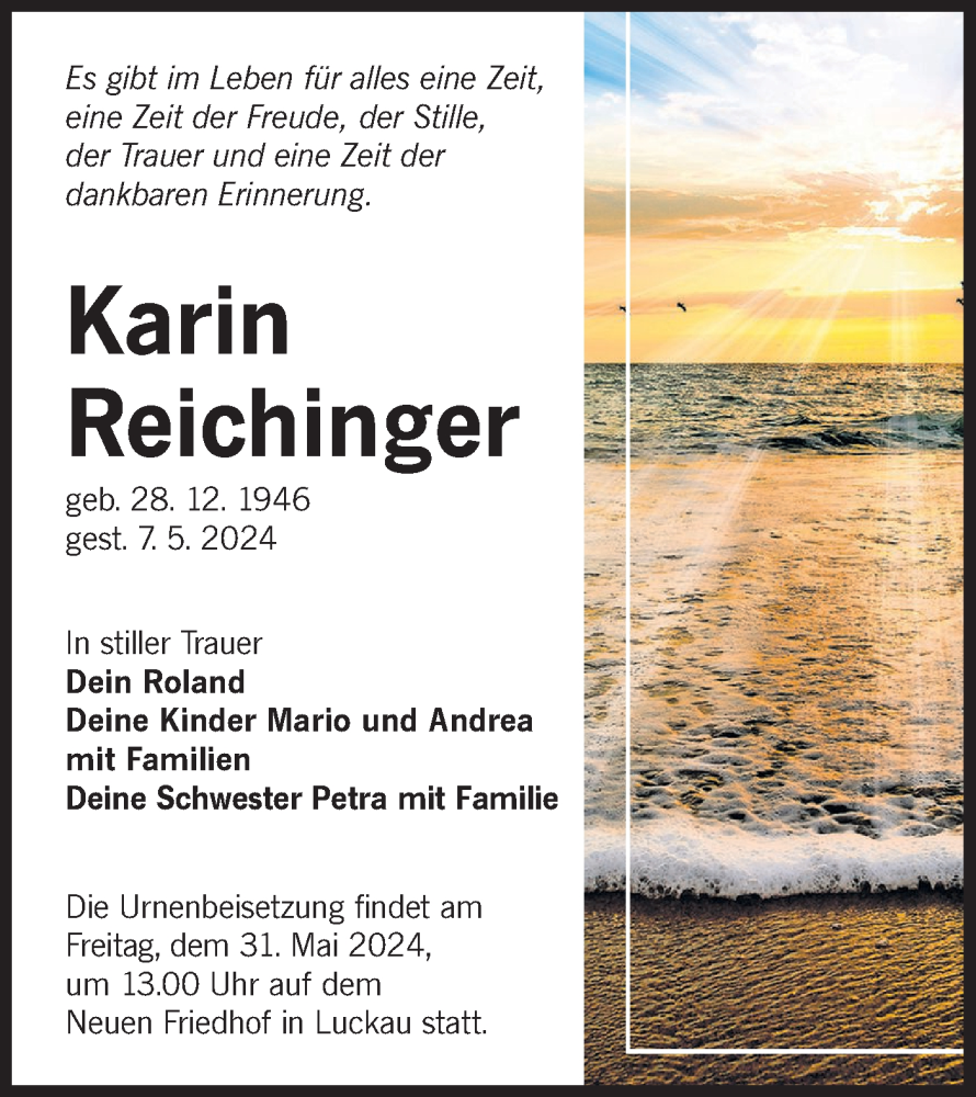 Hier finden Sie alle Traueranzeigen aus der Zeitung, die bisher für Karin Reichinger erschienen sind. Weitere Traueranzeigen, die in der Zeitung erscheinen, werden hier ebenfalls aufgelistet