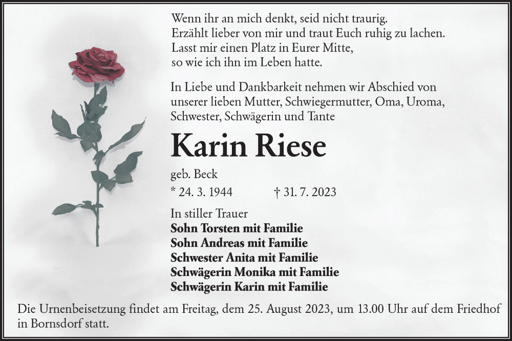 Hier finden Sie alle Traueranzeigen aus der Zeitung, die bisher für Karin Riese erschienen sind. Weitere Traueranzeigen, die in der Zeitung erscheinen, werden hier ebenfalls aufgelistet