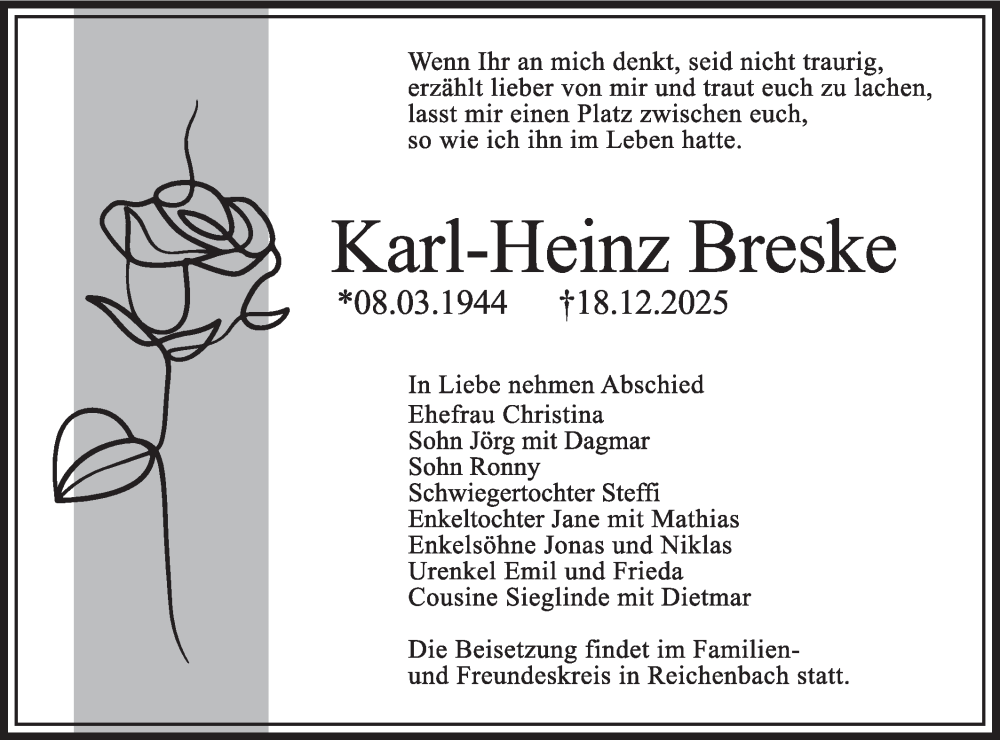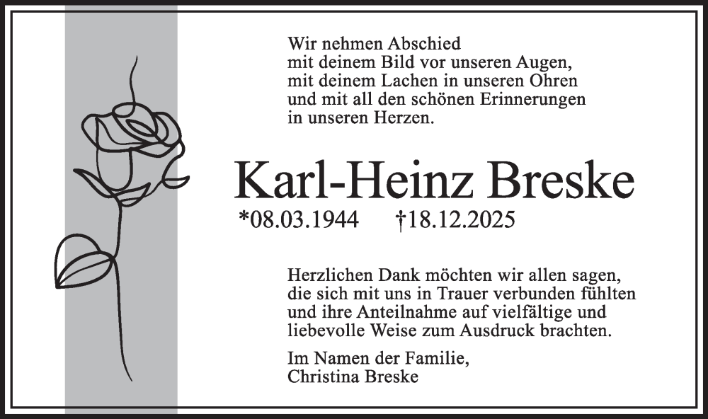 Hier finden Sie alle Traueranzeigen aus der Zeitung, die bisher für Karl-Heinz Breske erschienen sind. Weitere Traueranzeigen, die in der Zeitung erscheinen, werden hier ebenfalls aufgelistet