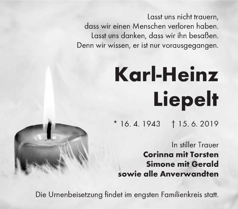 Hier finden Sie alle Traueranzeigen aus der Zeitung, die bisher für Karl-Heinz Liepelt erschienen sind. Weitere Traueranzeigen, die in der Zeitung erscheinen, werden hier ebenfalls aufgelistet