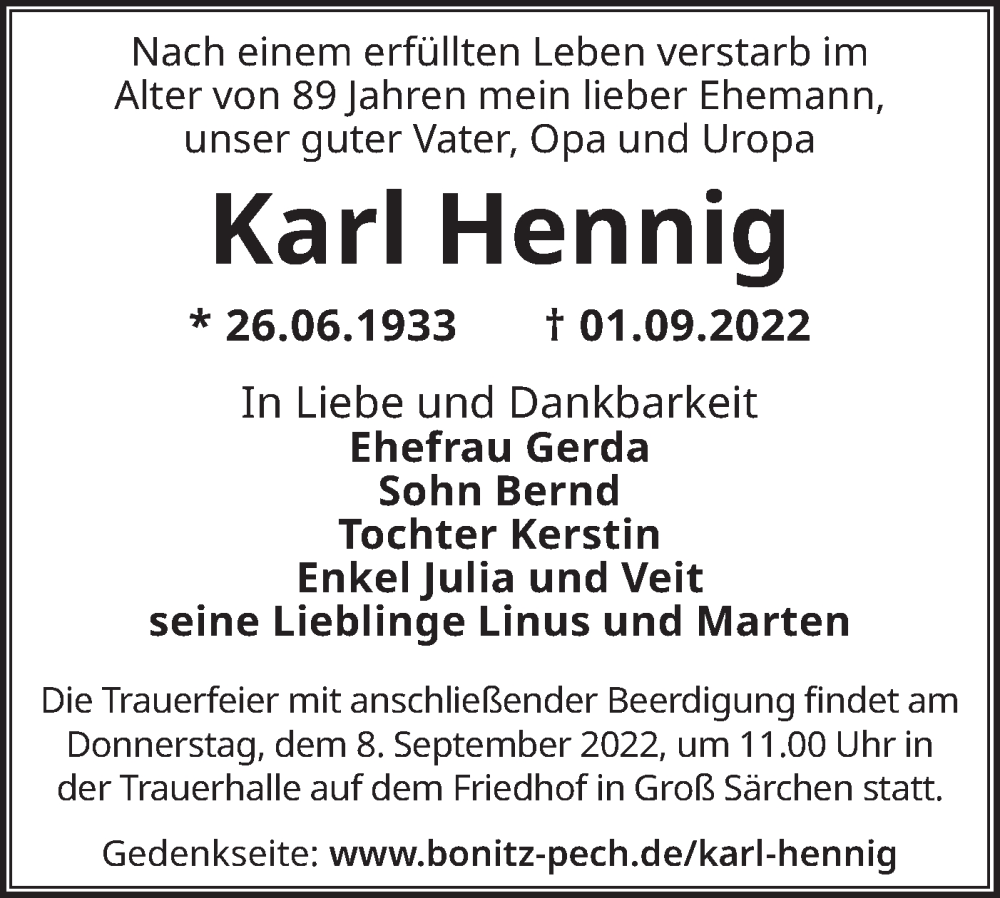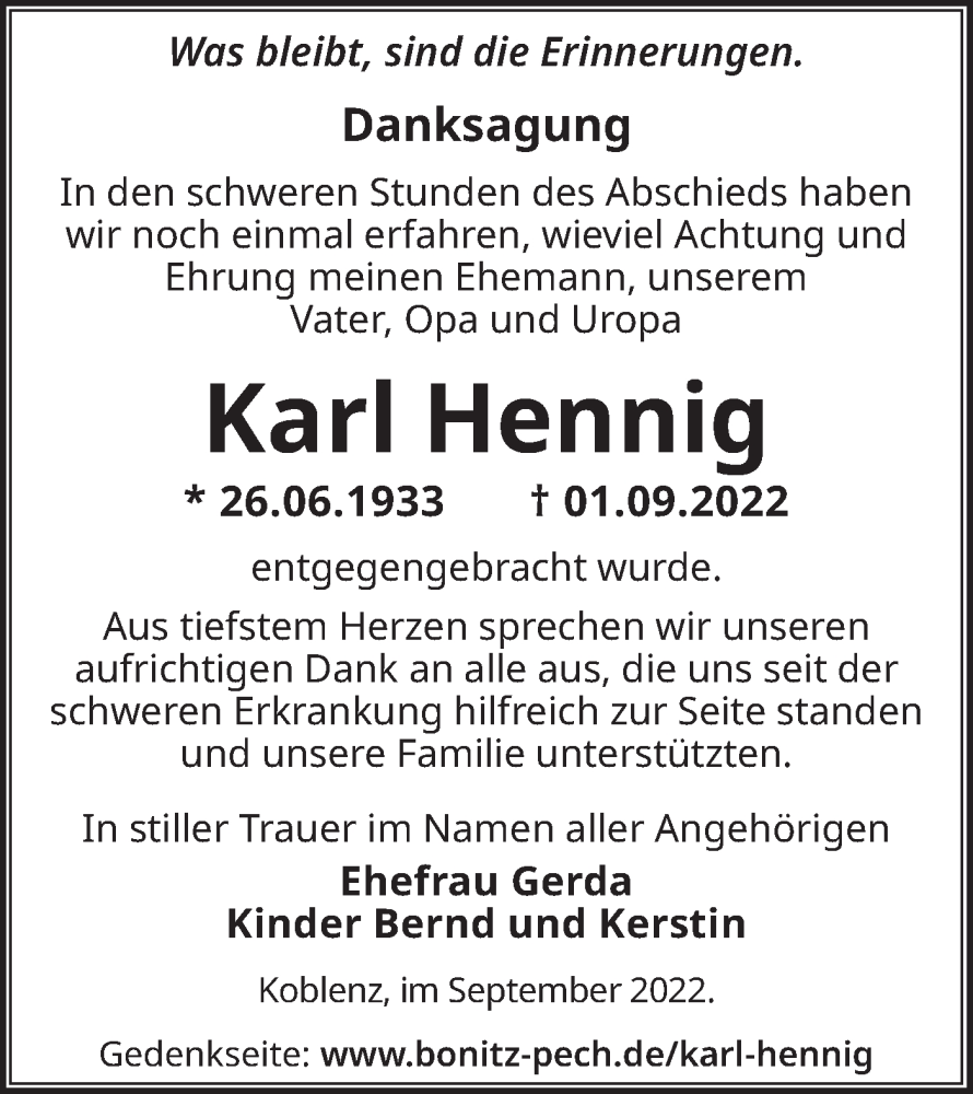 Hier finden Sie alle Traueranzeigen aus der Zeitung, die bisher für Karl Hennig erschienen sind. Weitere Traueranzeigen, die in der Zeitung erscheinen, werden hier ebenfalls aufgelistet