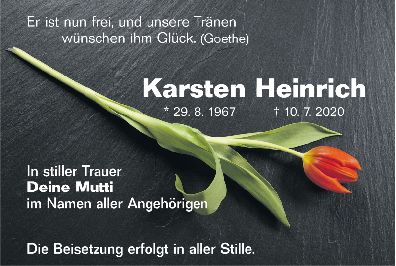 Hier finden Sie alle Traueranzeigen aus der Zeitung, die bisher für Karsten Heinrich erschienen sind. Weitere Traueranzeigen, die in der Zeitung erscheinen, werden hier ebenfalls aufgelistet