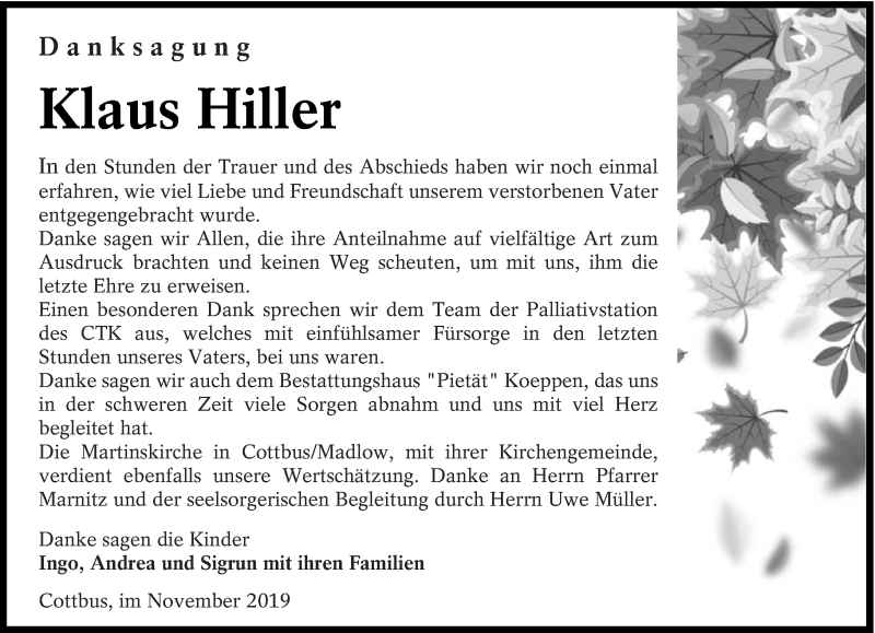 Hier finden Sie alle Traueranzeigen aus der Zeitung, die bisher für Klaus Hiller erschienen sind. Weitere Traueranzeigen, die in der Zeitung erscheinen, werden hier ebenfalls aufgelistet