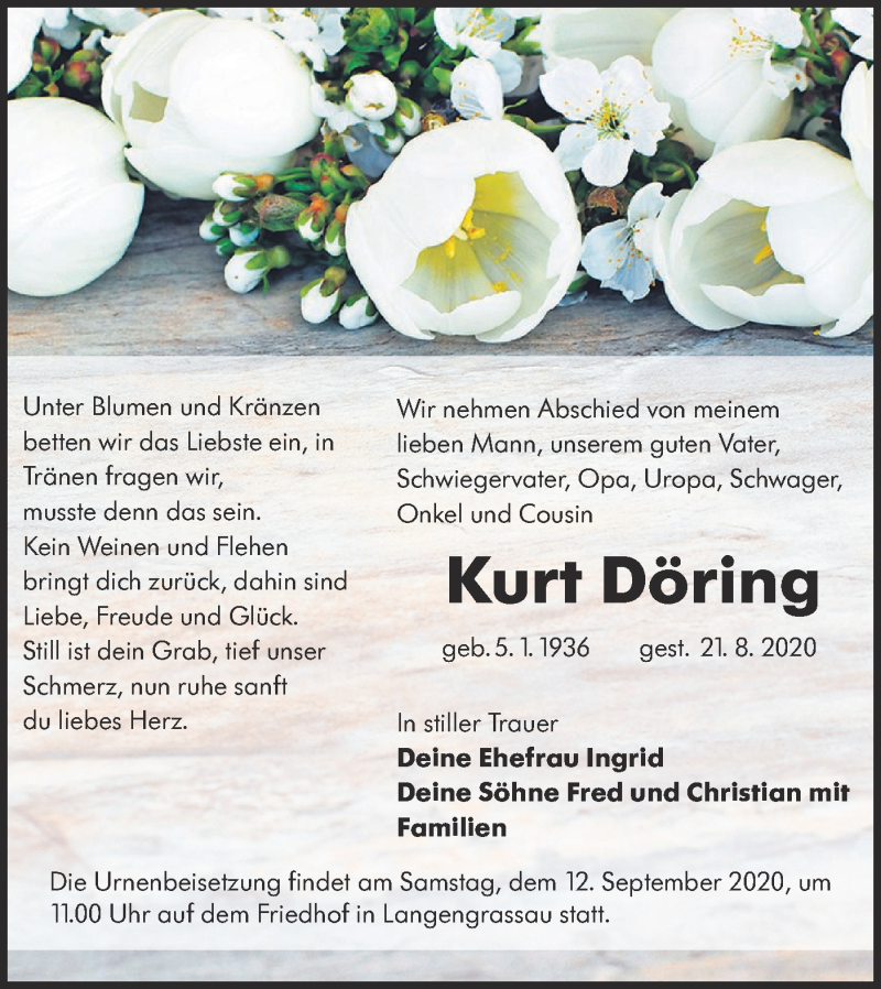 Hier finden Sie alle Traueranzeigen aus der Zeitung, die bisher für Kurt Döring erschienen sind. Weitere Traueranzeigen, die in der Zeitung erscheinen, werden hier ebenfalls aufgelistet