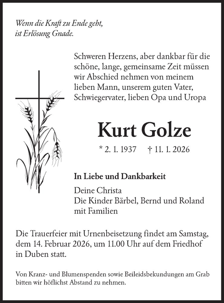 Hier finden Sie alle Traueranzeigen aus der Zeitung, die bisher für Kurt Golze erschienen sind. Weitere Traueranzeigen, die in der Zeitung erscheinen, werden hier ebenfalls aufgelistet