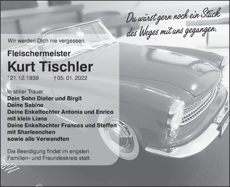 Hier finden Sie alle Traueranzeigen aus der Zeitung, die bisher für Kurt Tischler erschienen sind. Weitere Traueranzeigen, die in der Zeitung erscheinen, werden hier ebenfalls aufgelistet