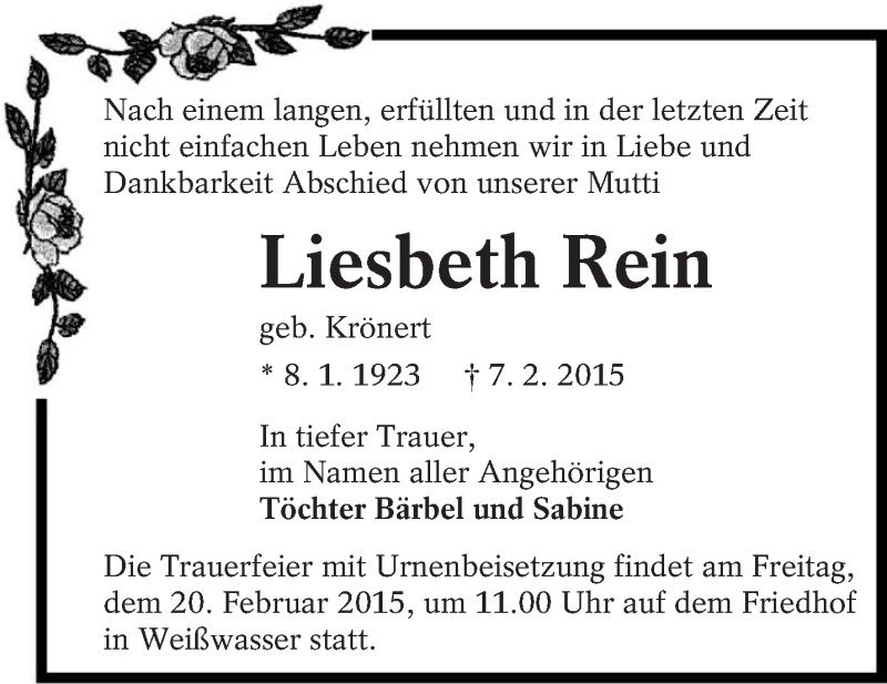 Hier finden Sie alle Traueranzeigen aus der Zeitung, die bisher für Liesbeth Rein erschienen sind. Weitere Traueranzeigen, die in der Zeitung erscheinen, werden hier ebenfalls aufgelistet