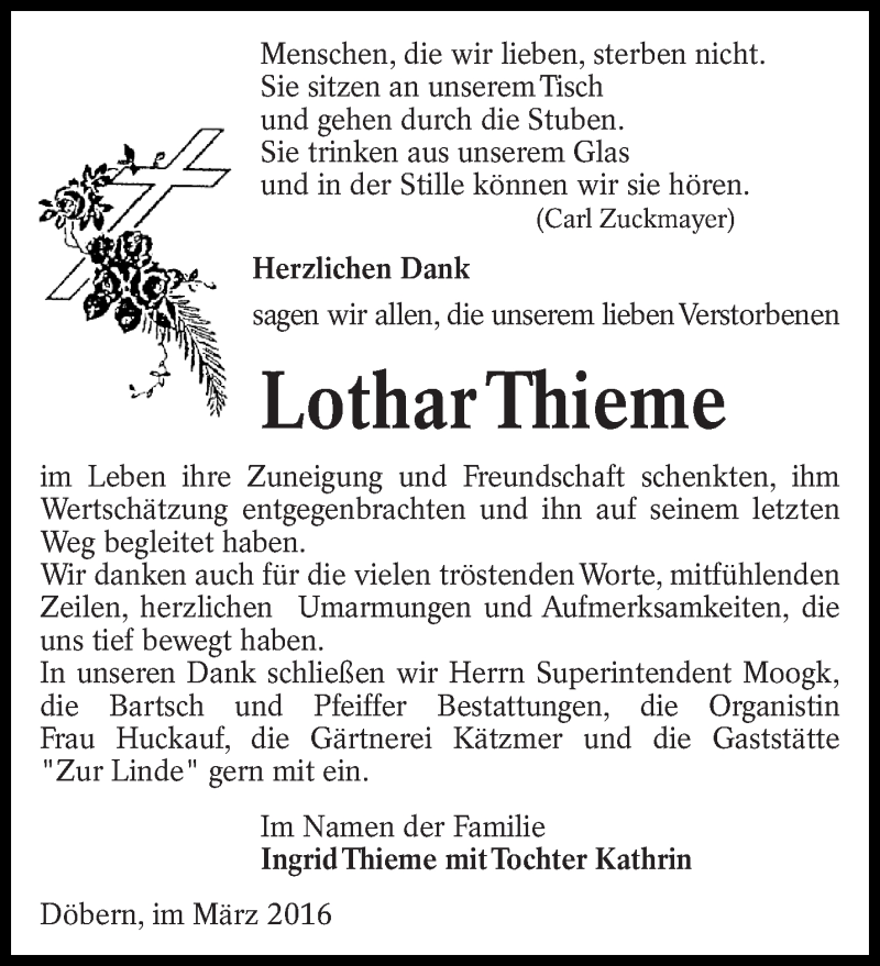 Hier finden Sie alle Traueranzeigen aus der Zeitung, die bisher für Lothar Thieme erschienen sind. Weitere Traueranzeigen, die in der Zeitung erscheinen, werden hier ebenfalls aufgelistet