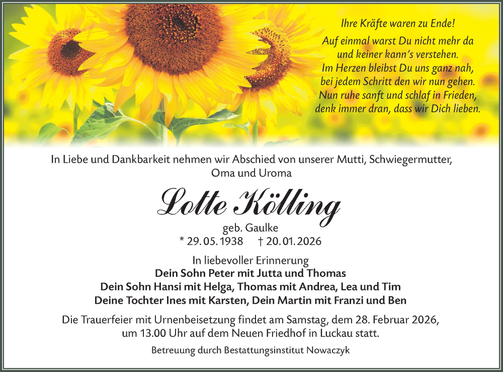 Hier finden Sie alle Traueranzeigen aus der Zeitung, die bisher für Lotte Kölling erschienen sind. Weitere Traueranzeigen, die in der Zeitung erscheinen, werden hier ebenfalls aufgelistet