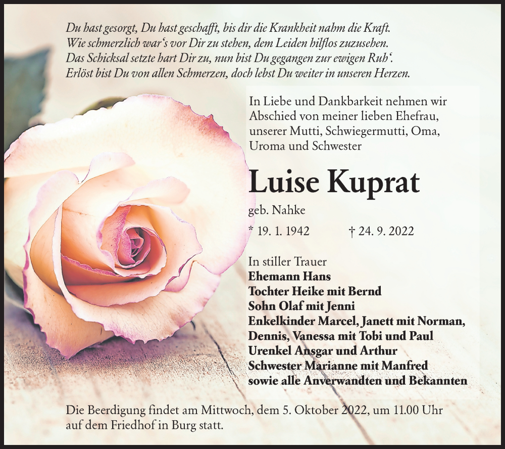 Hier finden Sie alle Traueranzeigen aus der Zeitung, die bisher für Luise Kuprat erschienen sind. Weitere Traueranzeigen, die in der Zeitung erscheinen, werden hier ebenfalls aufgelistet