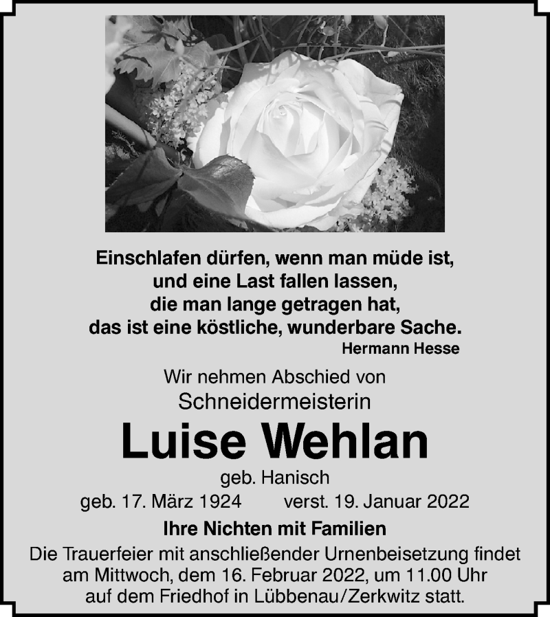 Hier finden Sie alle Traueranzeigen aus der Zeitung, die bisher für Luise Wehlan erschienen sind. Weitere Traueranzeigen, die in der Zeitung erscheinen, werden hier ebenfalls aufgelistet