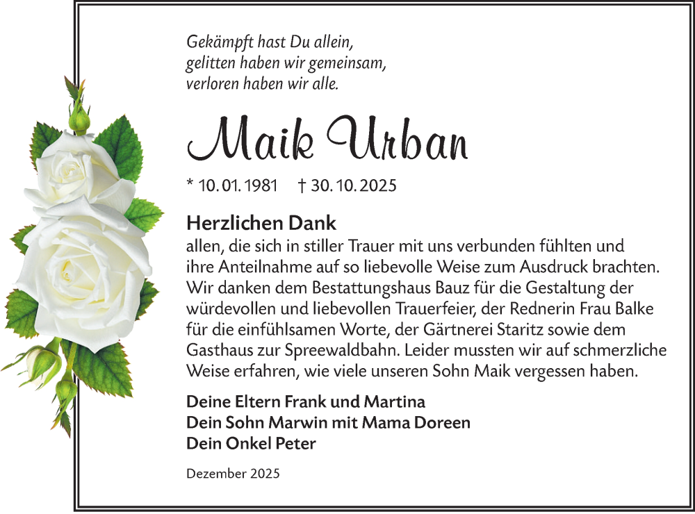 Hier finden Sie alle Traueranzeigen aus der Zeitung, die bisher für Maik Urban erschienen sind. Weitere Traueranzeigen, die in der Zeitung erscheinen, werden hier ebenfalls aufgelistet
