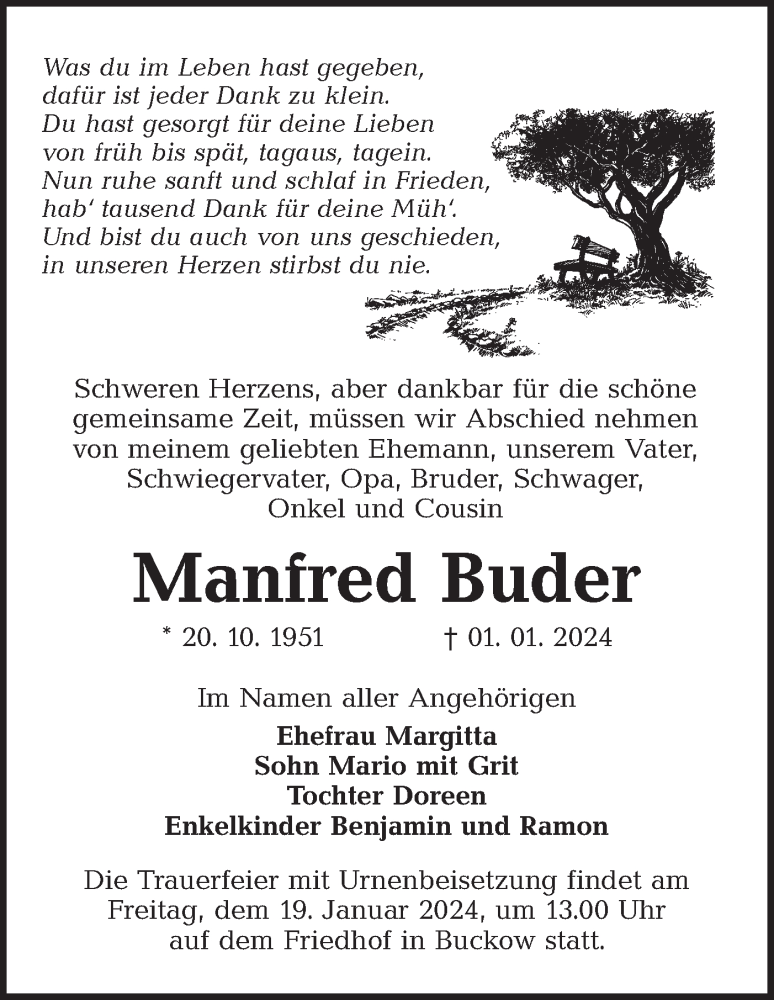 Hier finden Sie alle Traueranzeigen aus der Zeitung, die bisher für Manfred Buder erschienen sind. Weitere Traueranzeigen, die in der Zeitung erscheinen, werden hier ebenfalls aufgelistet