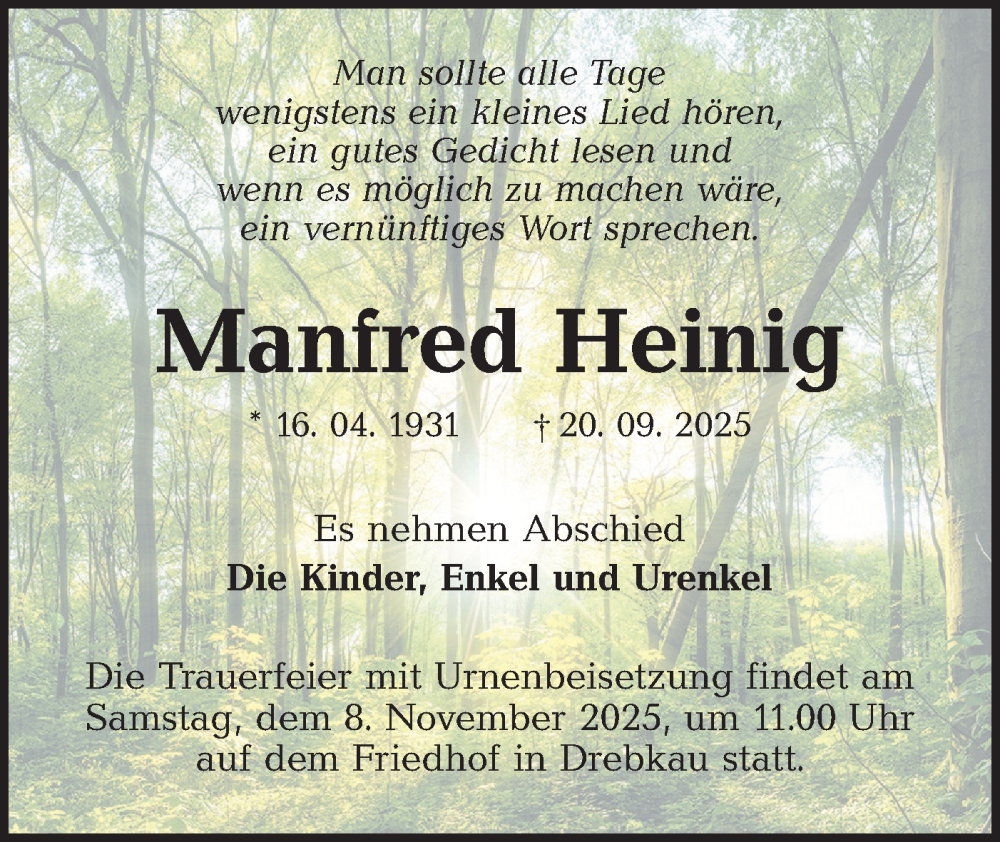 Hier finden Sie alle Traueranzeigen aus der Zeitung, die bisher für Manfred Heinig erschienen sind. Weitere Traueranzeigen, die in der Zeitung erscheinen, werden hier ebenfalls aufgelistet
