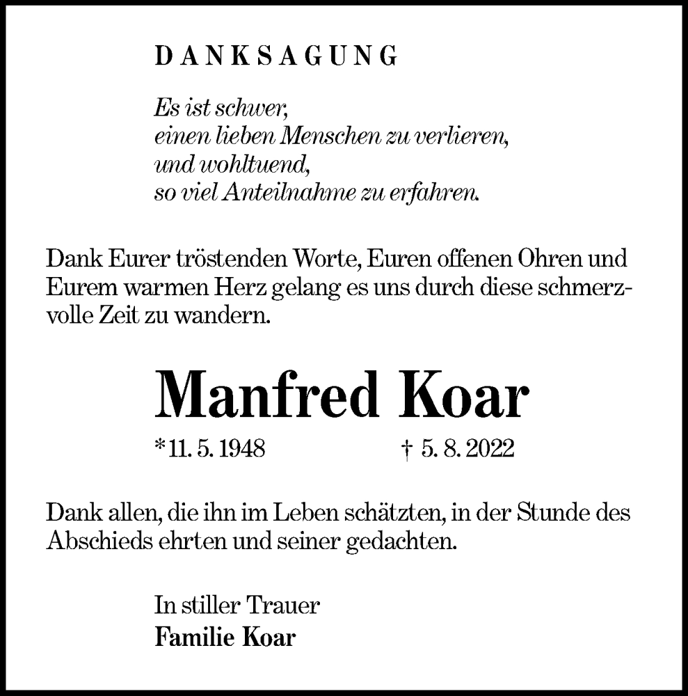 Hier finden Sie alle Traueranzeigen aus der Zeitung, die bisher für Manfred Koar erschienen sind. Weitere Traueranzeigen, die in der Zeitung erscheinen, werden hier ebenfalls aufgelistet