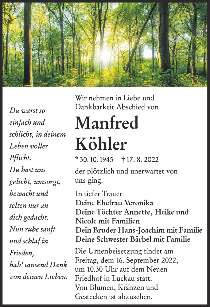 Hier finden Sie alle Traueranzeigen aus der Zeitung, die bisher für Manfred Köhler erschienen sind. Weitere Traueranzeigen, die in der Zeitung erscheinen, werden hier ebenfalls aufgelistet