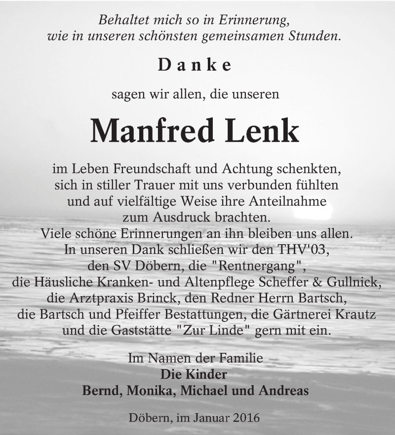 Hier finden Sie alle Traueranzeigen aus der Zeitung, die bisher für Manfred Lenk erschienen sind. Weitere Traueranzeigen, die in der Zeitung erscheinen, werden hier ebenfalls aufgelistet