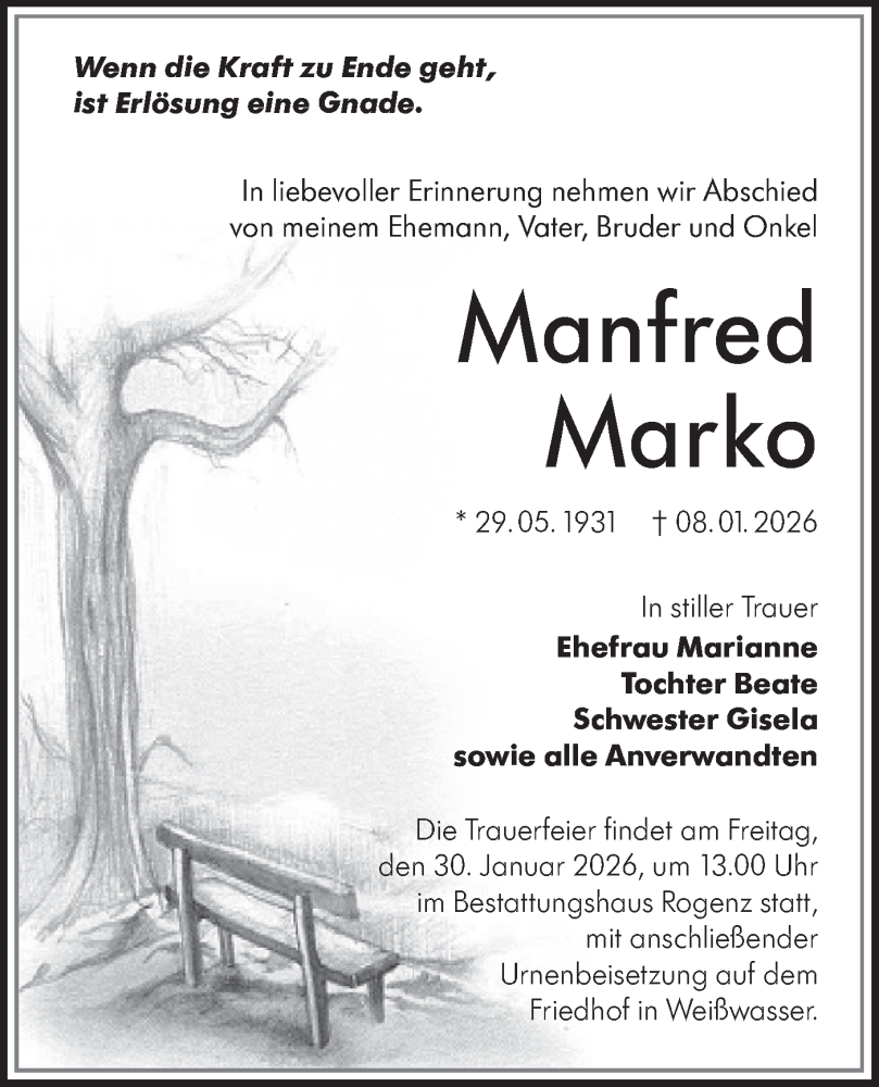 Hier finden Sie alle Traueranzeigen aus der Zeitung, die bisher für Manfred Marko erschienen sind. Weitere Traueranzeigen, die in der Zeitung erscheinen, werden hier ebenfalls aufgelistet
