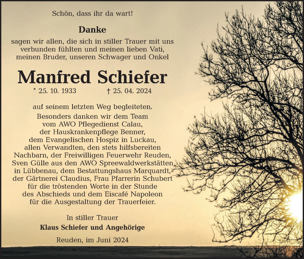 Hier finden Sie alle Traueranzeigen aus der Zeitung, die bisher für Manfred Schiefer erschienen sind. Weitere Traueranzeigen, die in der Zeitung erscheinen, werden hier ebenfalls aufgelistet