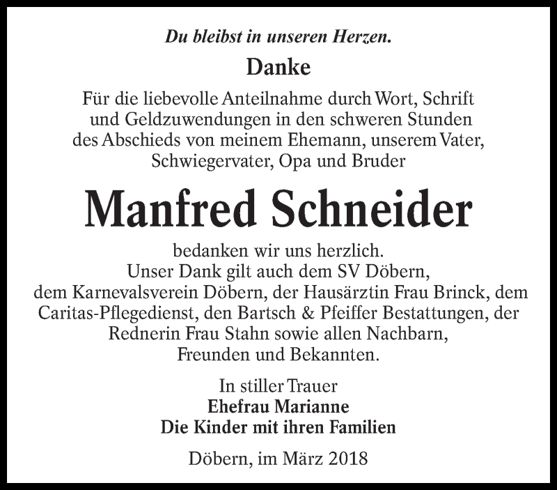 Hier finden Sie alle Traueranzeigen aus der Zeitung, die bisher für Manfred Schneider erschienen sind. Weitere Traueranzeigen, die in der Zeitung erscheinen, werden hier ebenfalls aufgelistet