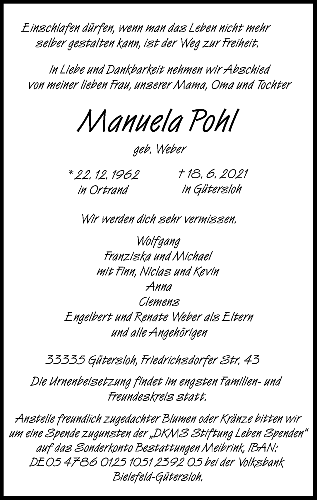 Hier finden Sie alle Traueranzeigen aus der Zeitung, die bisher für Manuela Pohl erschienen sind. Weitere Traueranzeigen, die in der Zeitung erscheinen, werden hier ebenfalls aufgelistet