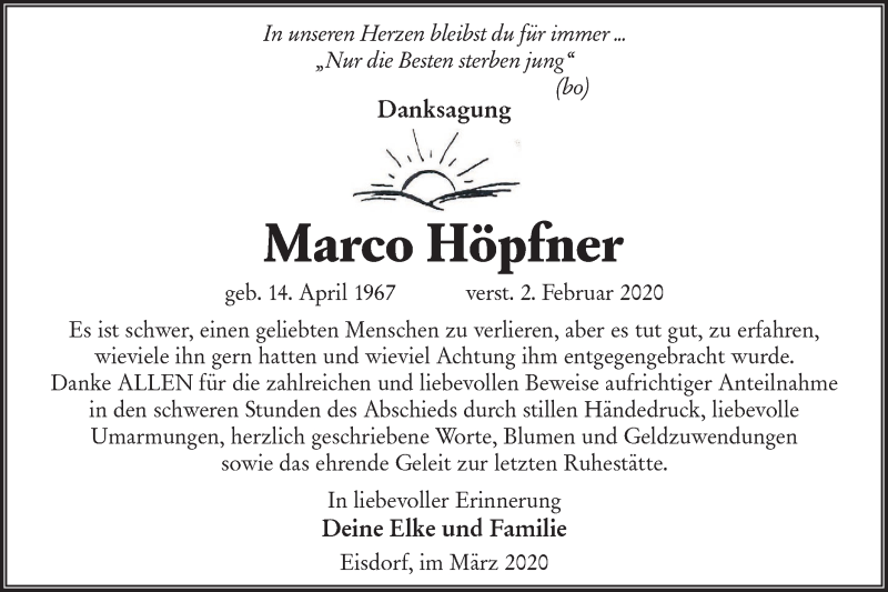 Hier finden Sie alle Traueranzeigen aus der Zeitung, die bisher für Marco Höpfner erschienen sind. Weitere Traueranzeigen, die in der Zeitung erscheinen, werden hier ebenfalls aufgelistet